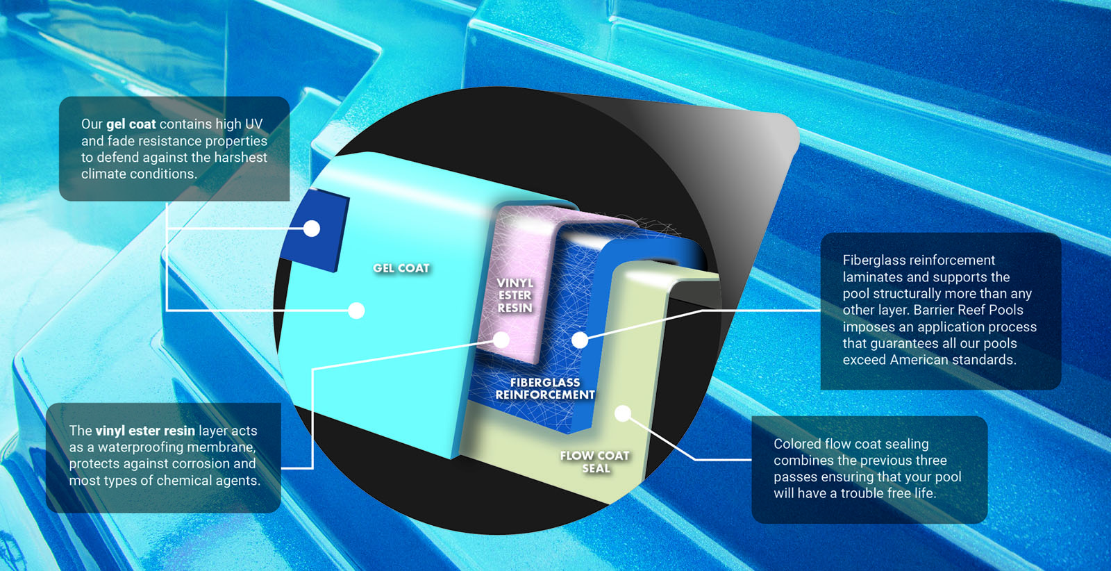 Crafting your in-ground fiberglass swimming pool involves utilizing top-tier gel coats and vinyl ester resins, renowned for their reliability. With an above-average thickness exceeding industry standards, we pride ourselves on delivering you one of the sturdiest and most dependable pools on the market.